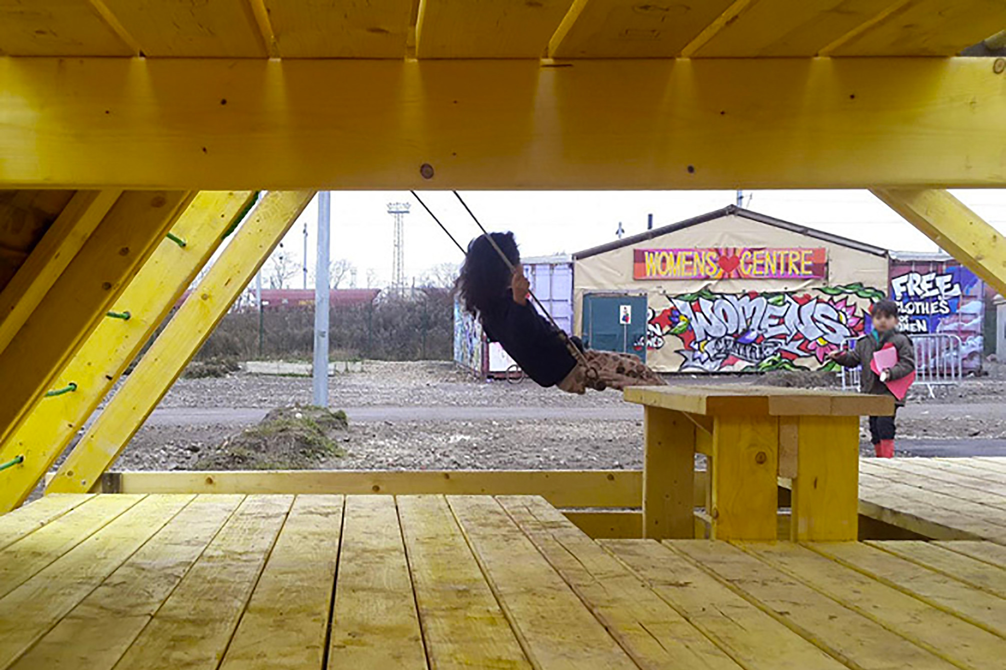 L’aire de jeux du camp de réfugiés de Grande-Synthe est un projet initié par la réunion de quatre collectifs d’architectes pour palier à la situation des enfants réfugiés. Souvent dé-scolarisés et parfois livrés à eux même des journées entières, leurs seuls jouets sont souvent les cailloux qu’ils trouvent au sol. Il était nécéssaire de créer un espace dédié aux jeux, pour que les enfants puissent se divertirent et se détacher quelques instants des conditions difficiles du camps. C’est un espace ouvert et accessible à toute heure même quand la petite école est fermée. Ce projet a été autorisé et soutenu par la Mairie qui a quant à elle financé le traitement du sol pour les jeux de ballon, mais la structure de jeux, elle, a été financée et construite bénévolement par les collectifs. Sa forme particulière en prisme lui donne une grande stabilité, et permet de jouer sans risques avec pourtant un coût en matériel trés bas.
